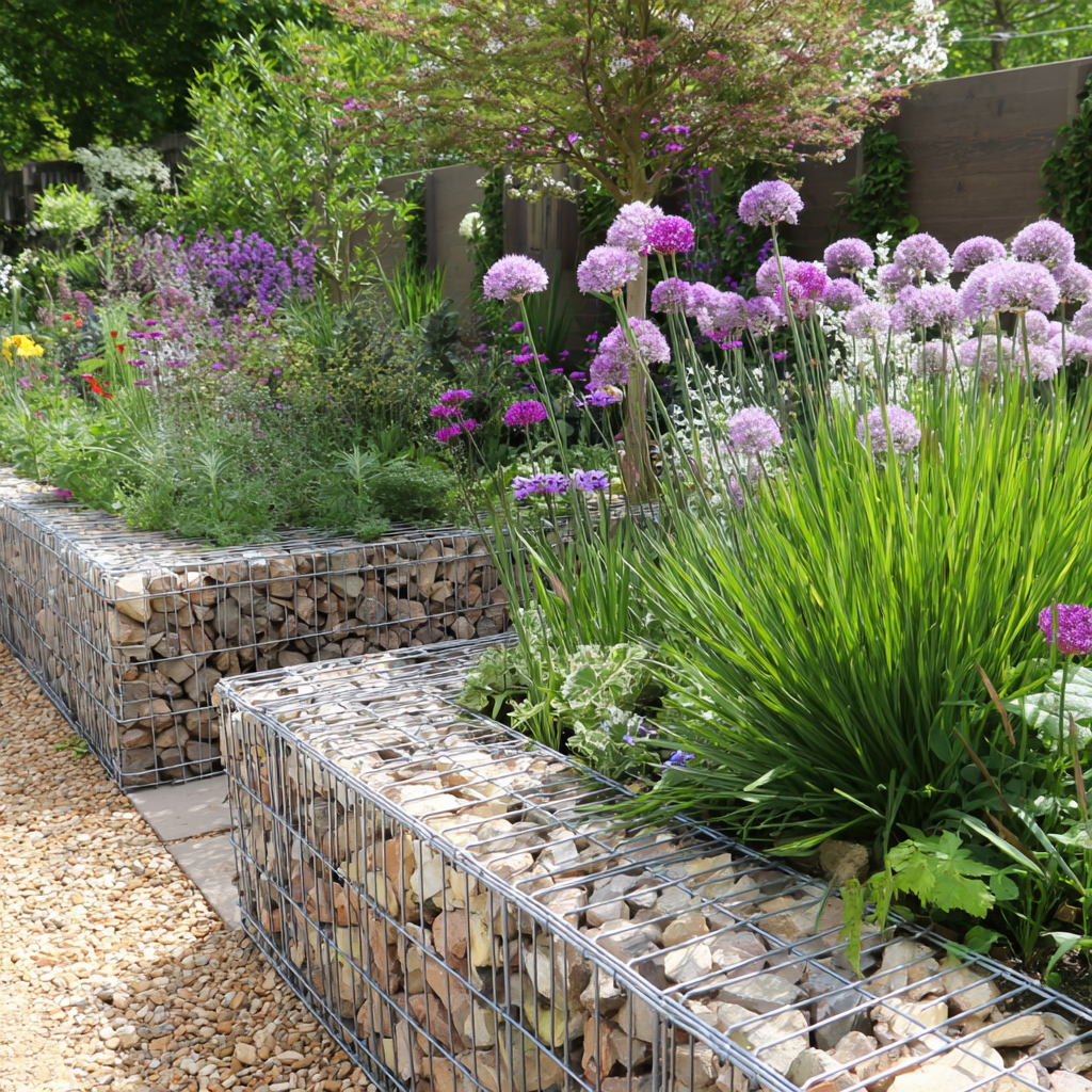 - Recycled materials like reclaimed wood and stone for paths and borders.